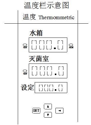 在溫度欄里共有三組數字屏,上面一組數字為水箱的測溫值;中間一組數字為滅菌室的測定溫度值,隨著加溫這兩組數字值會逐步上升。下面一組數字屏為溫度設定值,只有進入設定狀態時才可以改變其參數。這三組數字屏顯示的數字前三位是整數,后一位是小數,在個位數后有小數點。