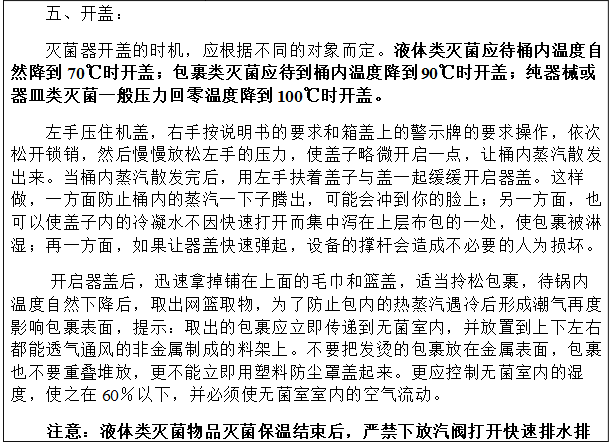 (10) 滅菌結(jié)束,在開(kāi)蓋時(shí)合取物時(shí),操作者應(yīng)戴長(zhǎng)統(tǒng)涂膠手套,一定按“開(kāi)蓋”章節(jié)要求操作。否則,桶內(nèi)騰出的高溫蒸汽和還處高溫的物體會(huì)燙傷皮膚。 (11)手柄鎖銷(xiāo)轉(zhuǎn)動(dòng)只能一個(gè)一個(gè)按蓋子上警示牌要求進(jìn)行,jue不能同時(shí)兩個(gè)手柄同時(shí)操作。
