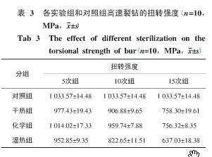 各實驗組和對照組高速裂鉆的扭轉強度計算結果見表3,如表3示:和對照組相比,隨著滅菌次數的增加,干熱滅菌法、化學浸泡法和濕熱滅菌法組內裂鉆的扭轉強度均逐漸減小。不同處理方法之間的比較顯示,在處理5次和10次時,干熱處理、化學浸泡和濕熱處理3種處理方法之間兩兩比較,扭轉強度的差異均有統計學意義(P<0.05);在處理15次時,化學浸泡和干熱處理引起的扭轉強度的差異無統計學意義,而濕熱處理組與化學浸泡和干熱處理組之間的差別均有統計學意義(P<0.05)。干熱滅菌法和化學浸泡法對裂鉆扭轉強度的影響相同且弱于濕熱滅菌法。